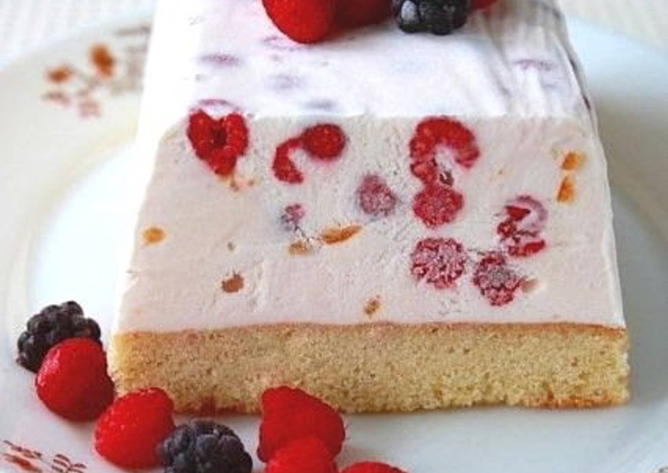 I wanted to make some ice cream with berries that I harvested. I don't want to eat uncooked eggs since I'm afraid of salmonella poisoning, so I came up with a recipe for an egg-free frozen cake. Italian frozen desserts like cassata and semifreddo gave me inspiration for the idea.