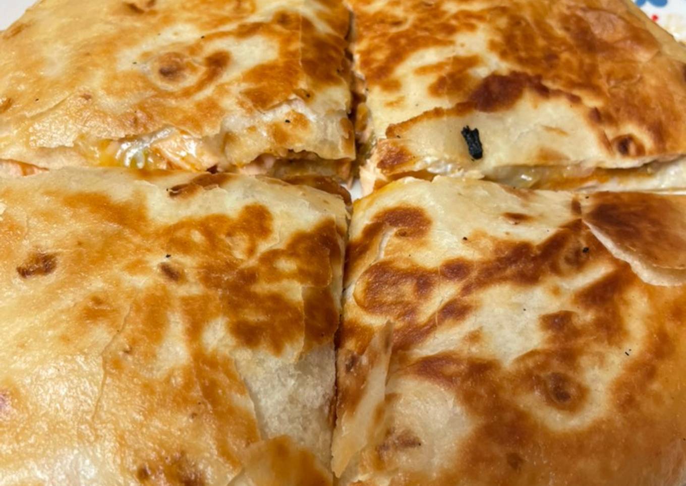 - In another skillet, add some oil to fry the quesadilla. Prepare your quesadilla in this order to near the edge of the tortilla: tortilla, sour cream spread thinly, shredded cheese, chicken mixture, shredded cheese again, cheese sauce spread thinly on top tortilla. Sandwich and press down. Heat the oil on medium high. Place your quesadilla in the skillet and fry for a couple of minutes. Once browned and crispy, gently flip with a spatula. Fry the other side until crispy. Cut into 4 pieces.