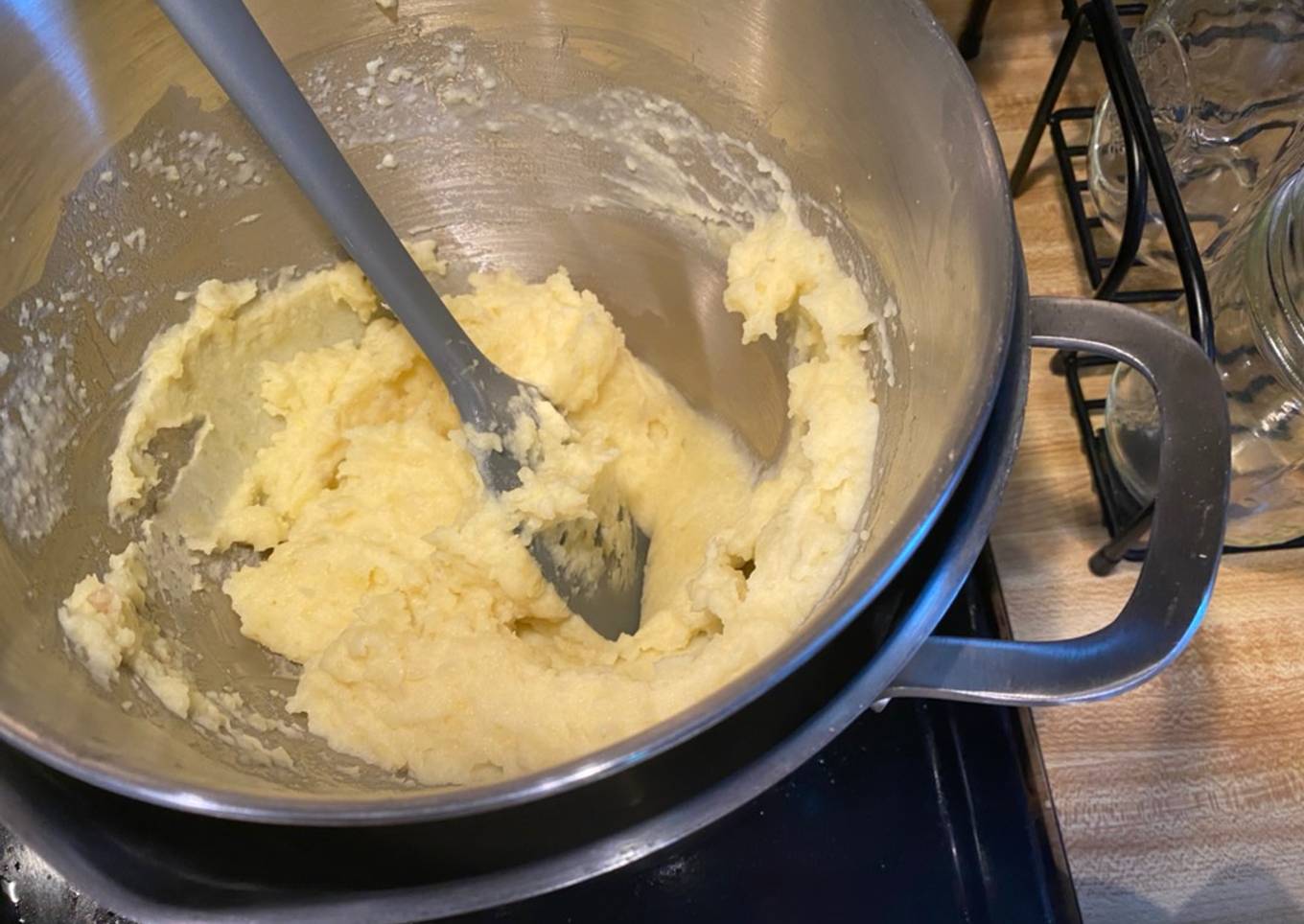 - Pass hot potatoes through ricer or food mill into a large bowl (cold potatoes will become gummy). Add butter and 4 tsp. salt and stir until butter is completely incorporated. Strain warm milk mixture through a fine-mesh sieve into a large measuring glass. Pour into potatoes ½-cupful at a time, stirring after each addition until liquid is fully incorporated and mixture is smooth before adding more.