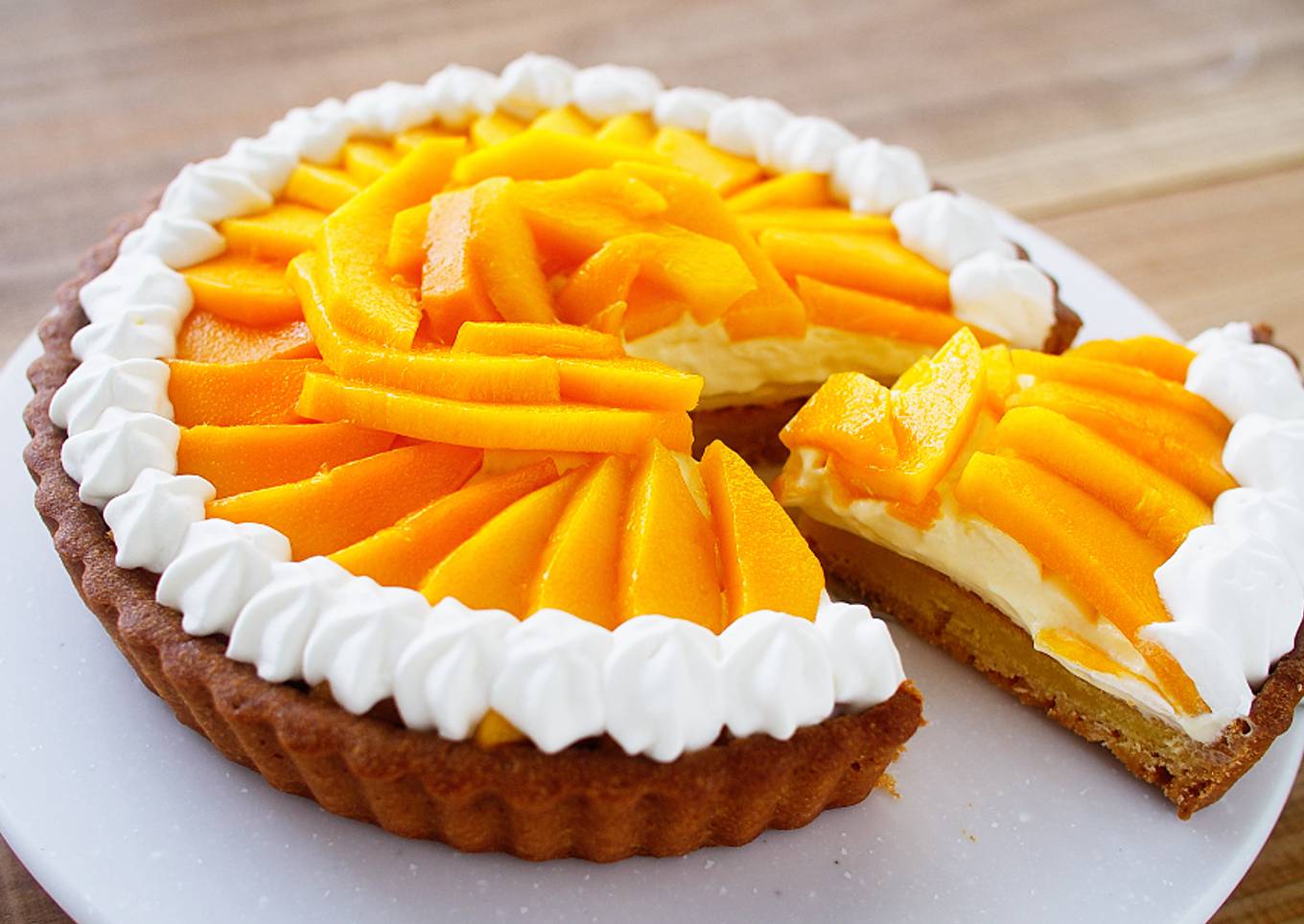 Arrange the mango slices on the top, starting in outwards to the center. Pipe the remaining whipped cream along the edges.