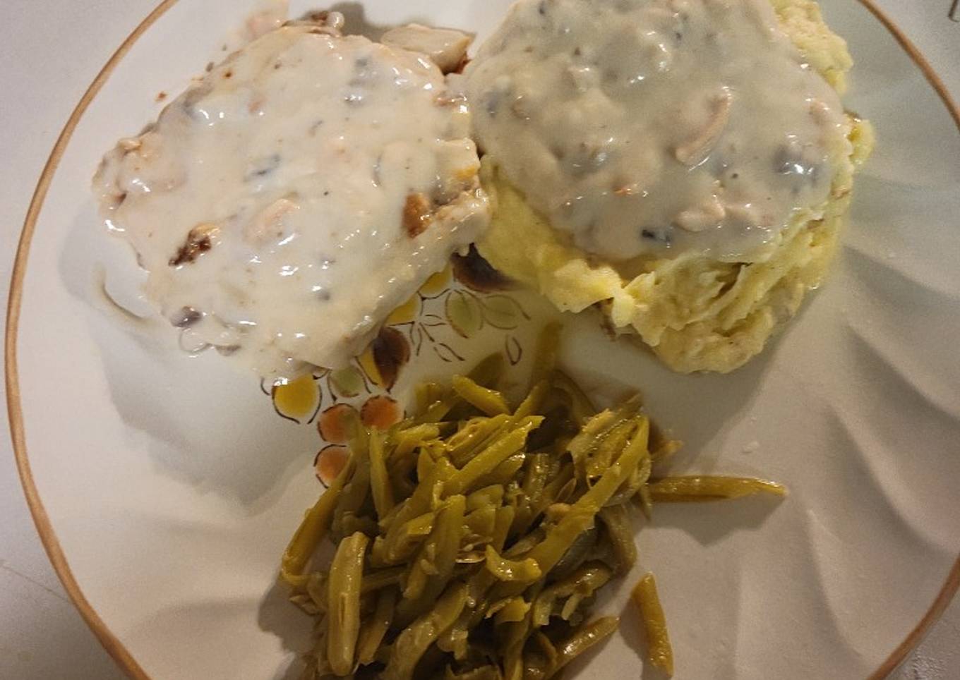 - Make sure that gravy is coated on both side simmer 2 minutes. Then serve I use the rest of the gravy to put over mashed potatoes