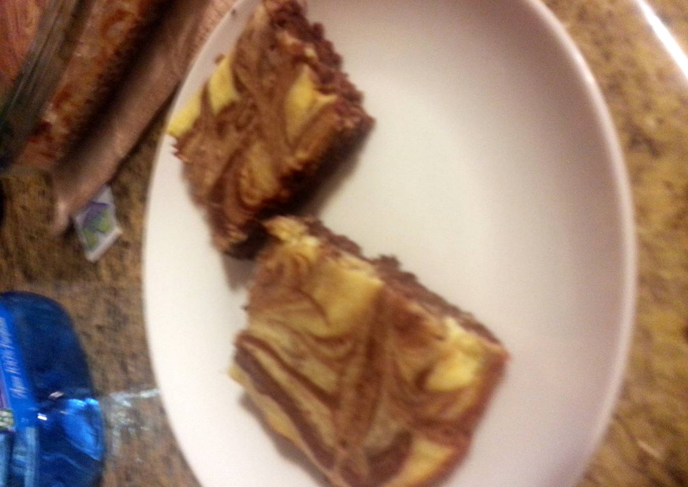 - Add spoons full of the cream cheese mix over the chocolate, sligtly moving arround (not mixing) to create a marbling effect.