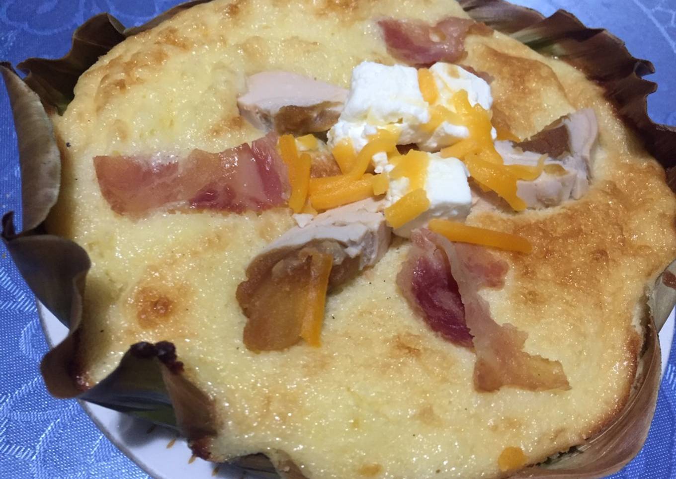 Philippine cake that is made with rice flour, water, and sometimes other ingredients (such as butter, sugar, cheese, Ham, Salted egg or coconut) and that is traditionally cooked between banana leaves.