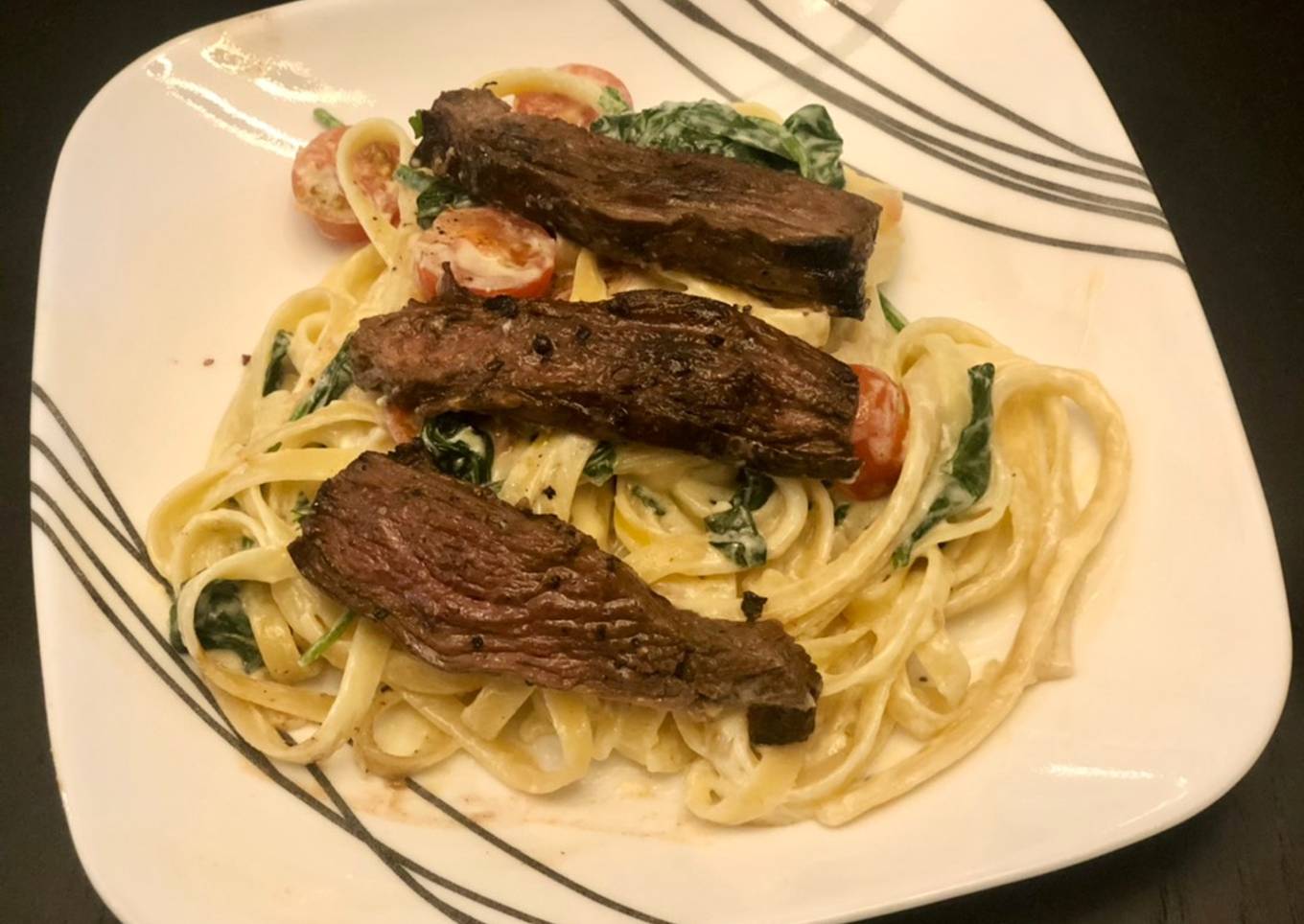 Based off of the "Creamy Steak Fettuccine" recipe from Delish, but with a better Alfredo sauce