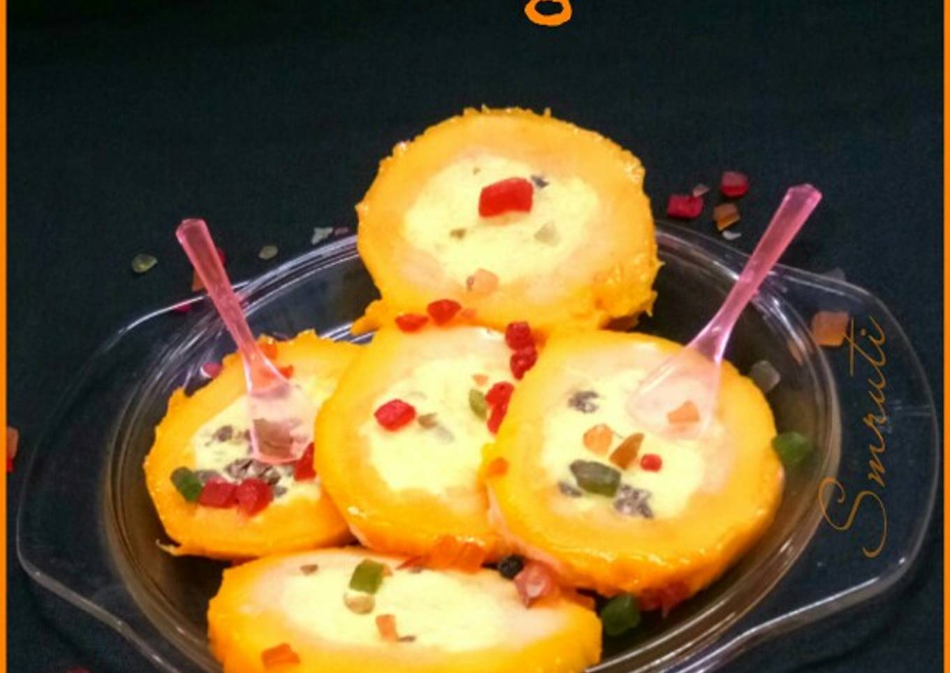 Cover the mango with the crown,freeze till 4-5 hours or over night on the glass go that the ice cream sets well in the mango. - When the ice cream sets peel the mango skin and slice them circles.
