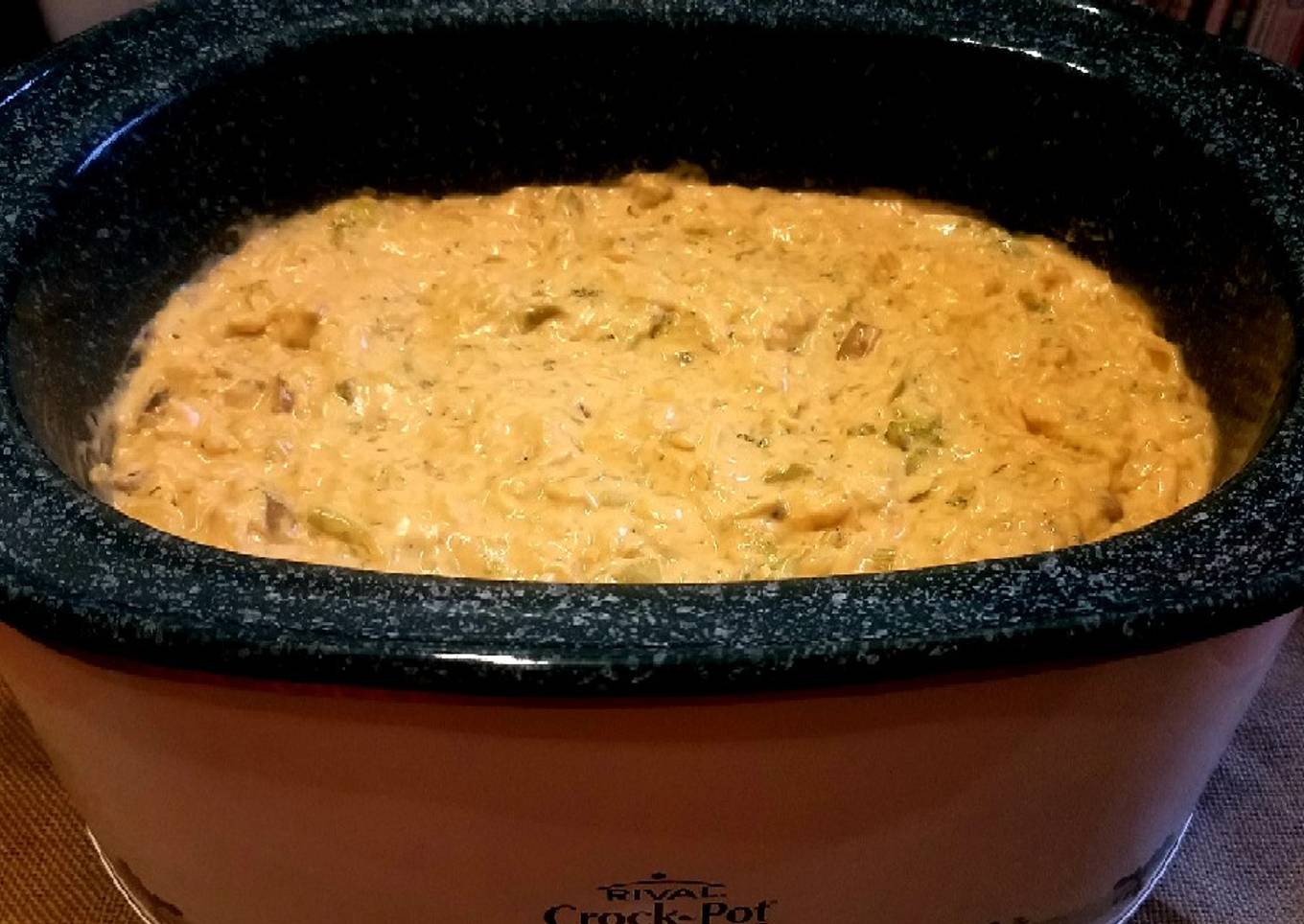 - Add rice and veggies to a crockpot and stir together. Add the cheese sauce.