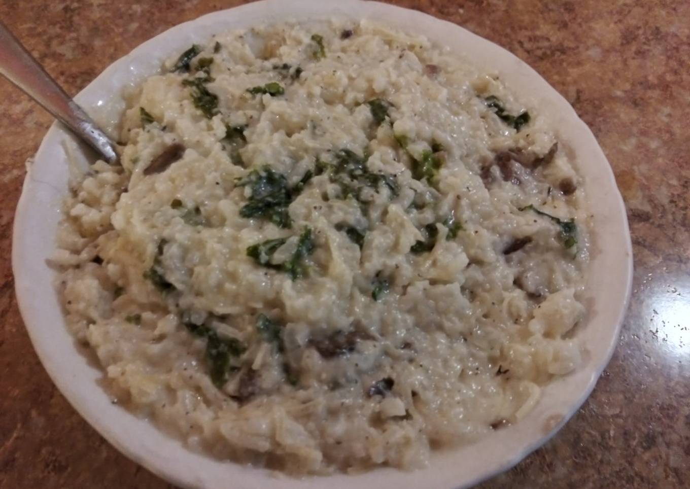 - Once the Cream and Stock mixture is warm add the Rice, Kale, Chicken and Mushrooms and cover on medium heat until boil stirring occasionally