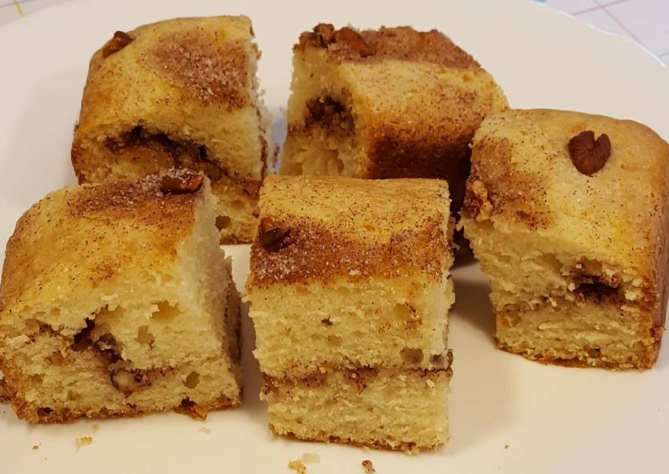 - Turn half of the batter into the prepared pan. Mix together 1/4 cup sugar, cinnamon and chopped nuts. Sprinkle half of the nut mixture over the batter. Top with the rest of the batter and sprinkle the other half of the nut mixture on top.