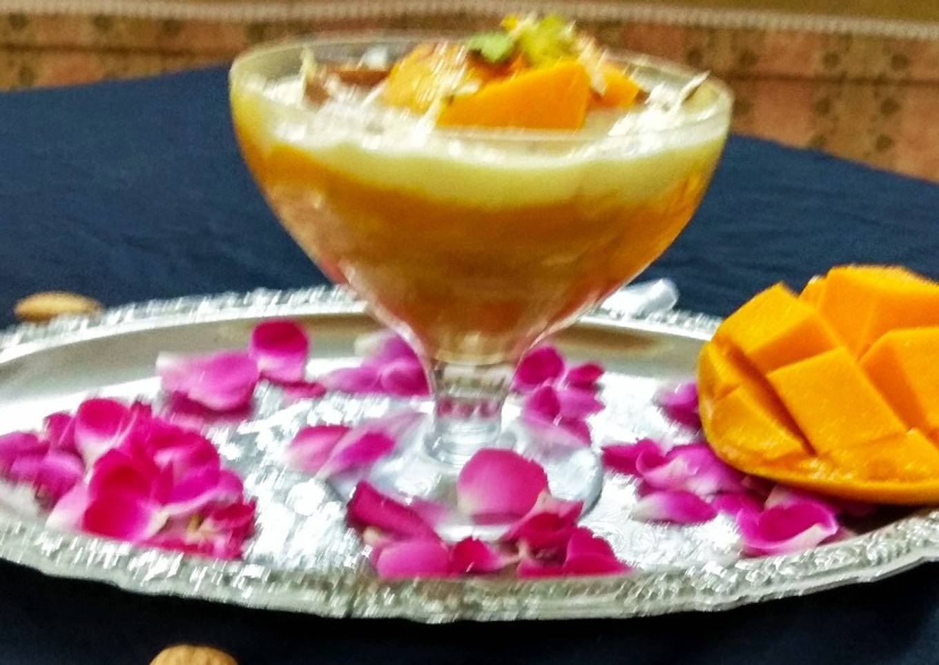 - Assemble mango puree,rabri, mango pieces, Dryfruits,