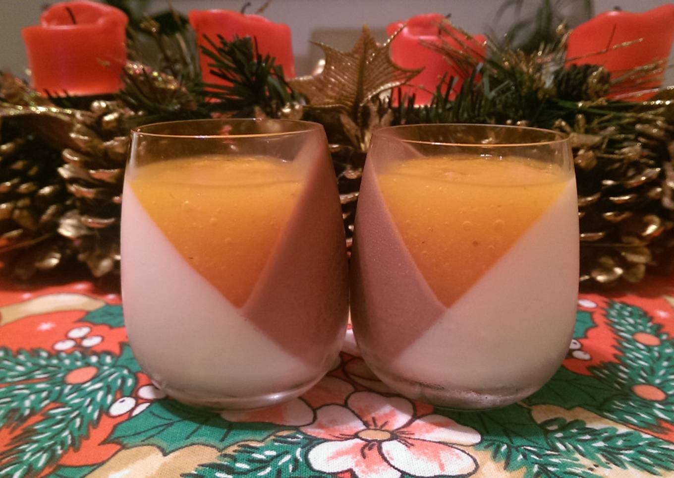 - After the vanilla Panna Cotta has set, turn the glasses on the tray, so that you can fill the rest of the space with the cocoa Panna Cotta mix.