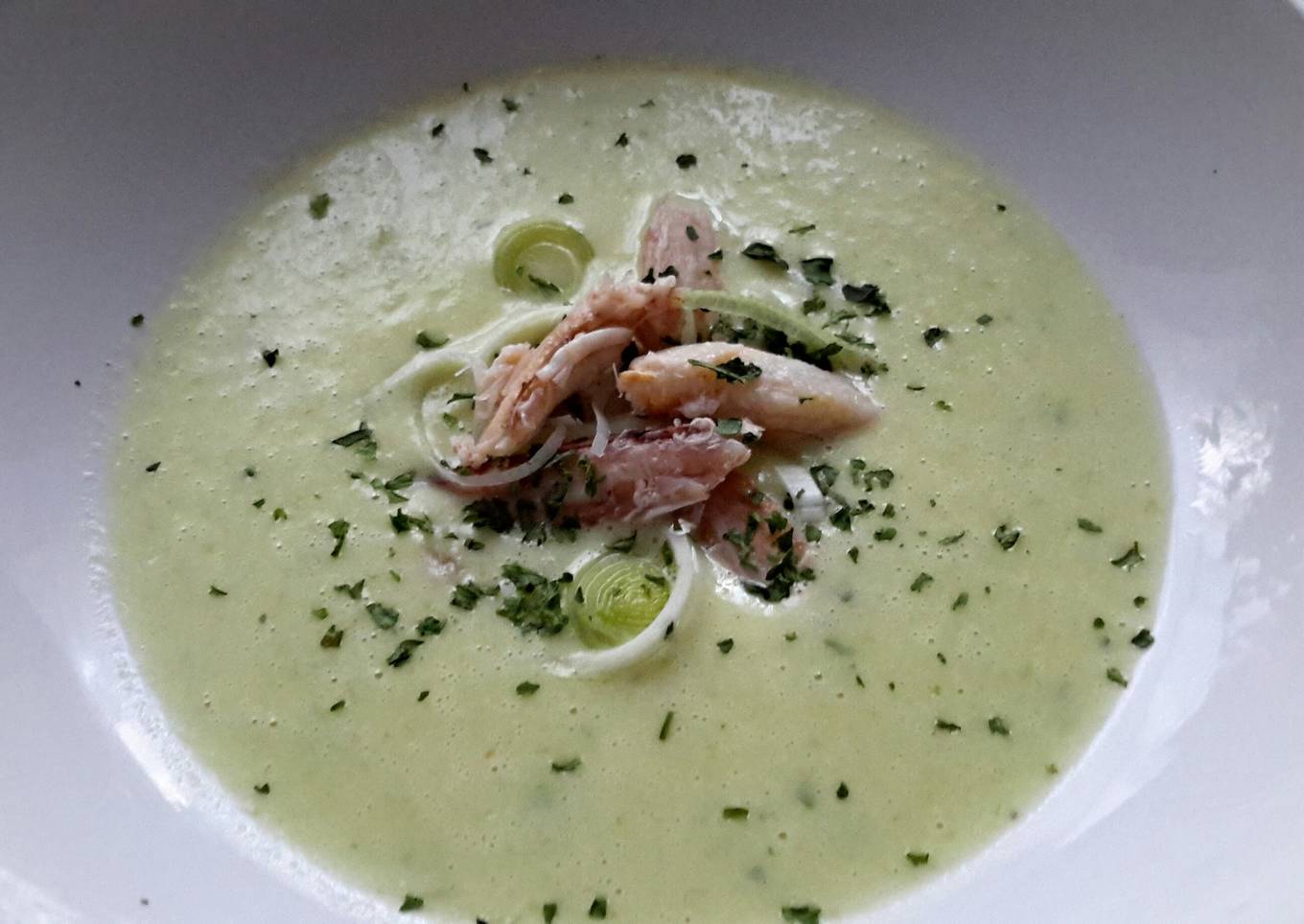 - Add the precooked crab meat just before serving with the rest of the cream and Leek cutting