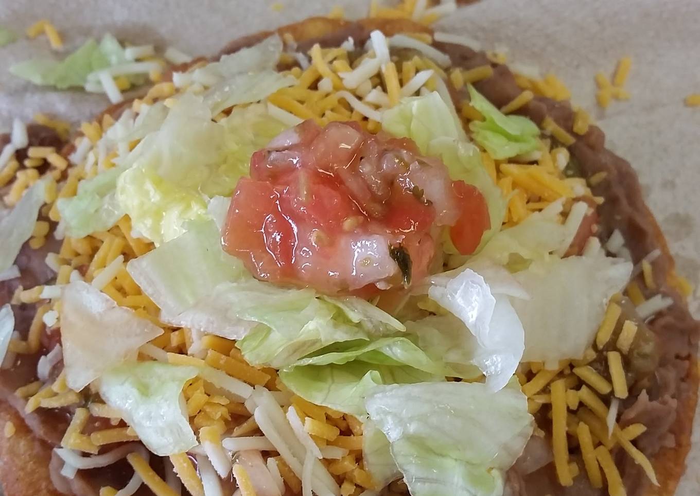 - Spread warm beans on tostada shell and build your tostada as you wish! Add all your goodies to it!