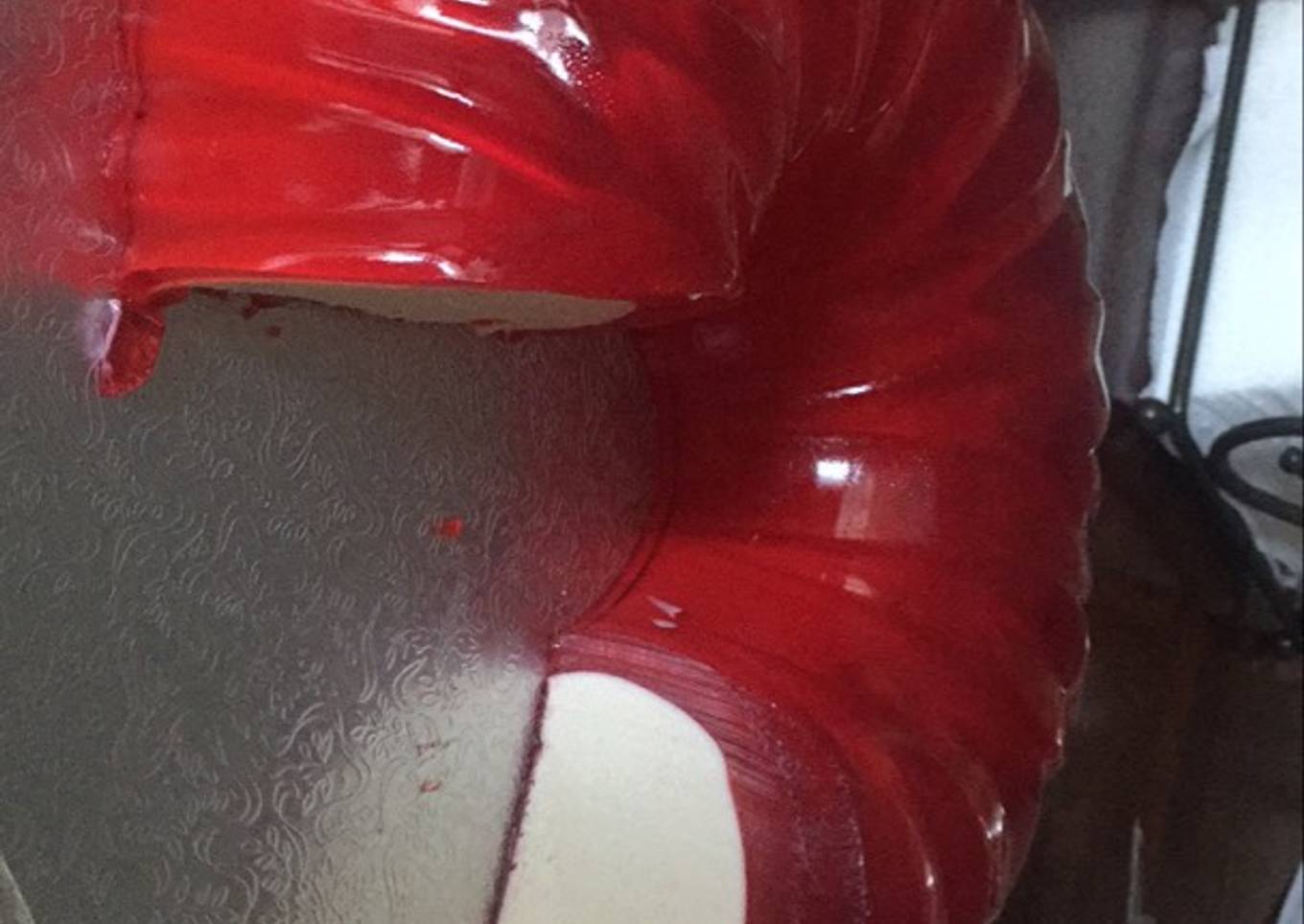 - Once cream cheese looks done, try to unstick it carefully don't remove though..just so you can pour ur jello slowly under the cream cheese..once you start to pour it will then start to flow