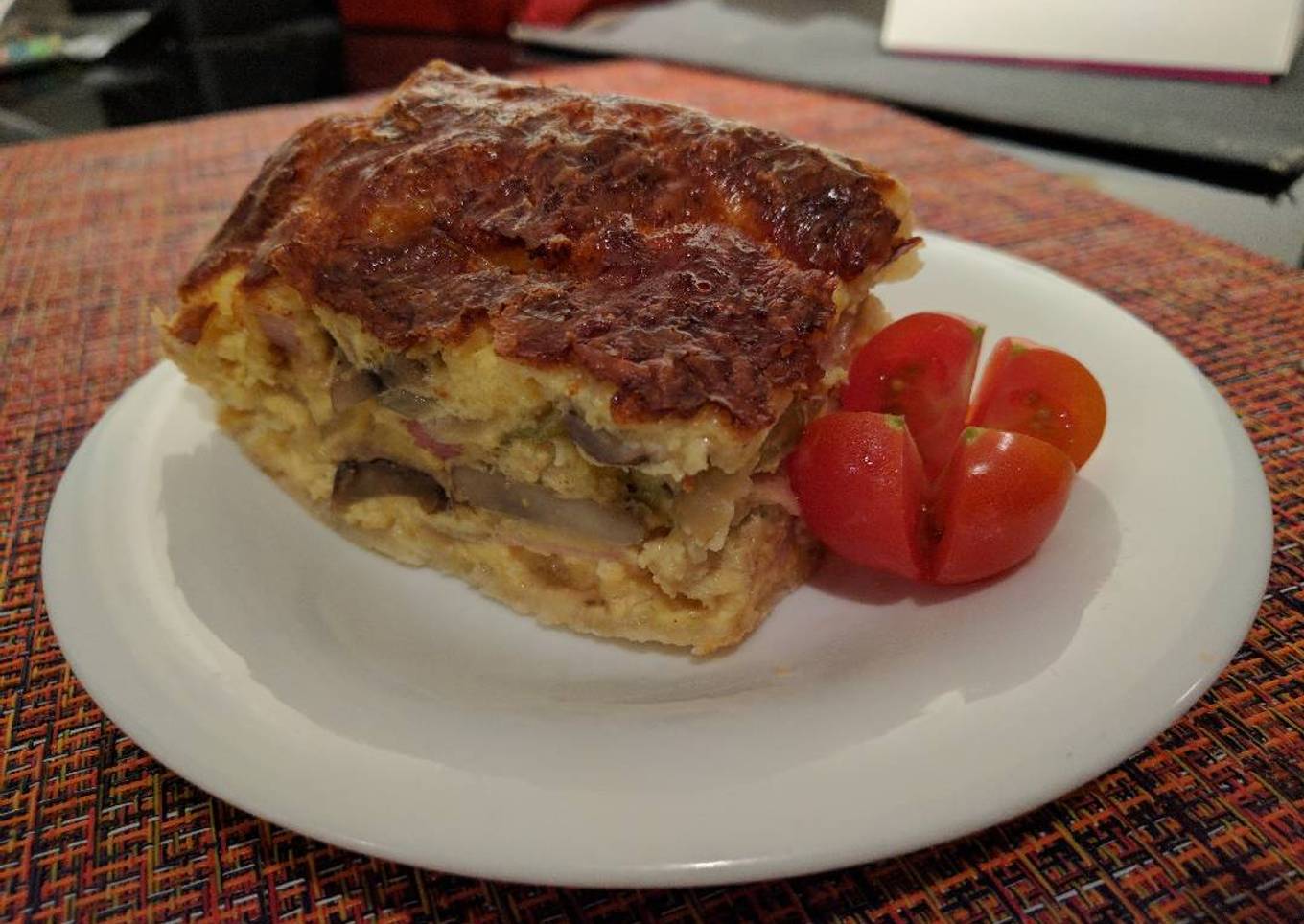 A thick quiche, full of delicious ingredients. Satisfaction guaranteed!